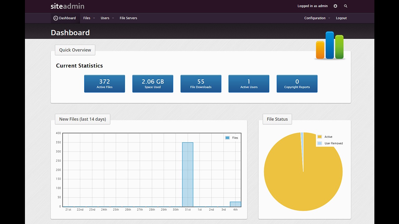 - Dashboard detailing downloads and active files.